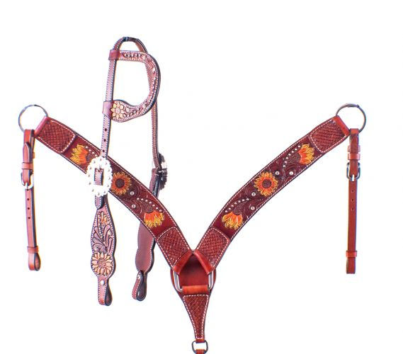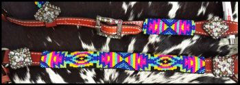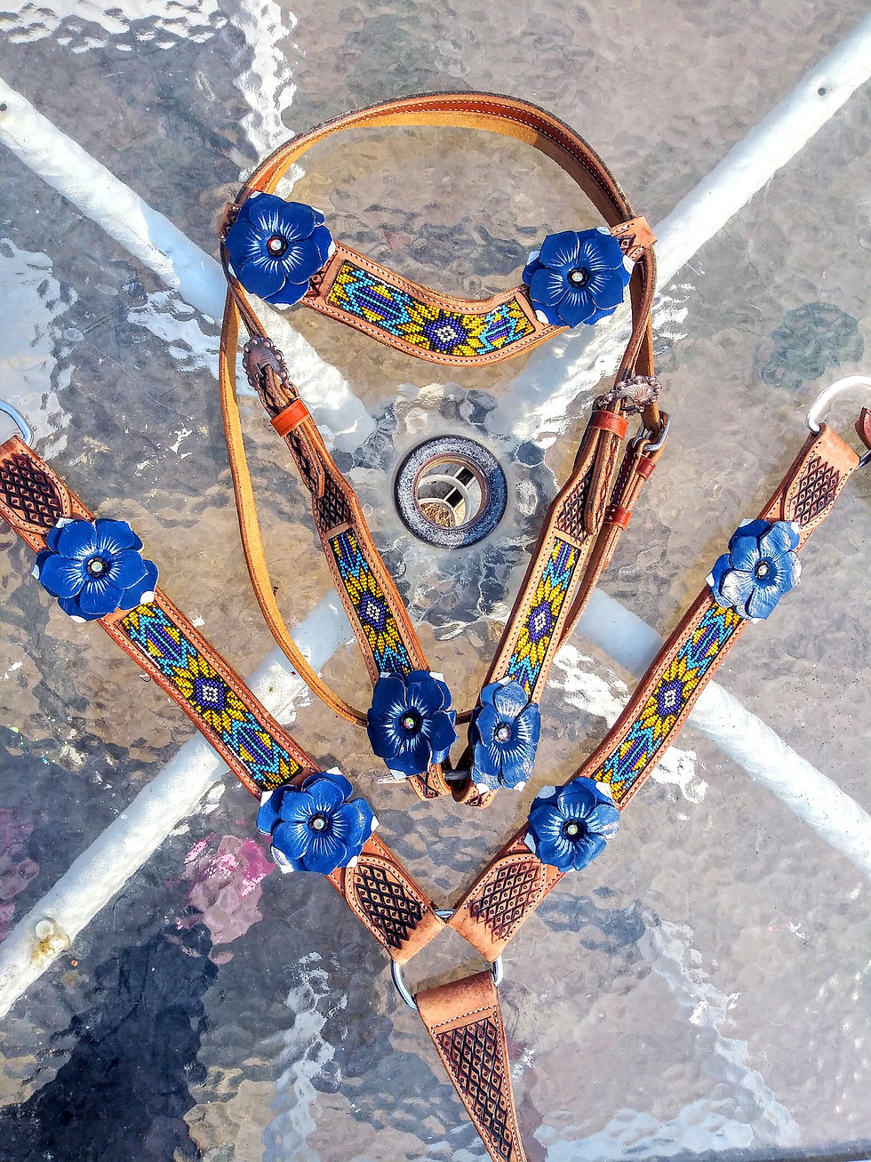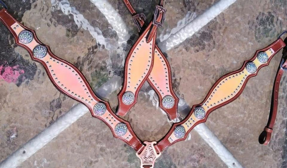 This Browband headstall is available for custom orders. This is one of my most popular options. Argentina leather. Available in medium, dark oil and black. This headstall is $225 full bling. Conchos can be added. Tripping collar shown is also available for custom orders. $350 full bling